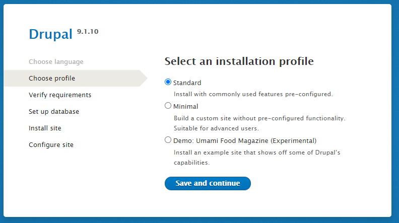 Standard - Install with commonly used features pre-configured. Minimal - Build a custom site without pre-configured functionality. Suitable for advanced users. Demo: Umami Food Magazine (Experimental) - Install an example site showcasing Drupal’s capabilities.