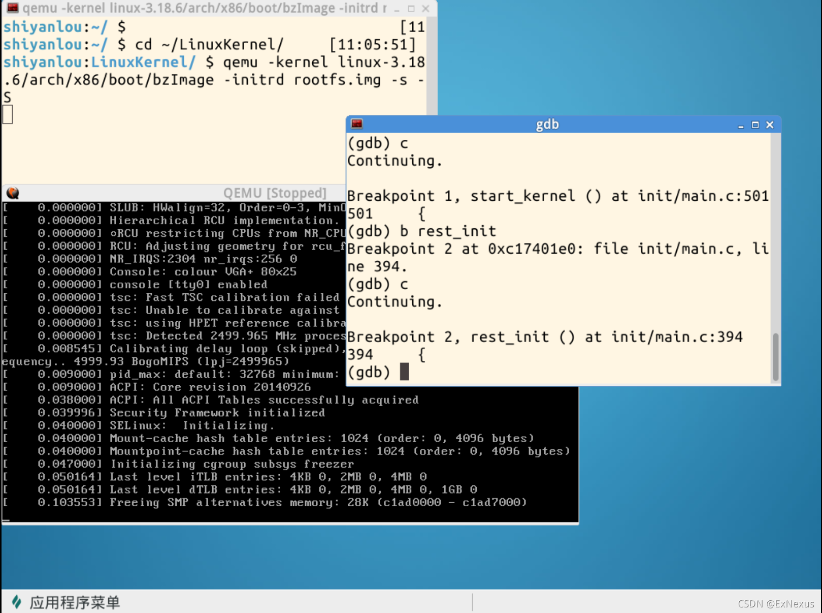 在 rest_init 处设置断点,继续执行,停在断点处: