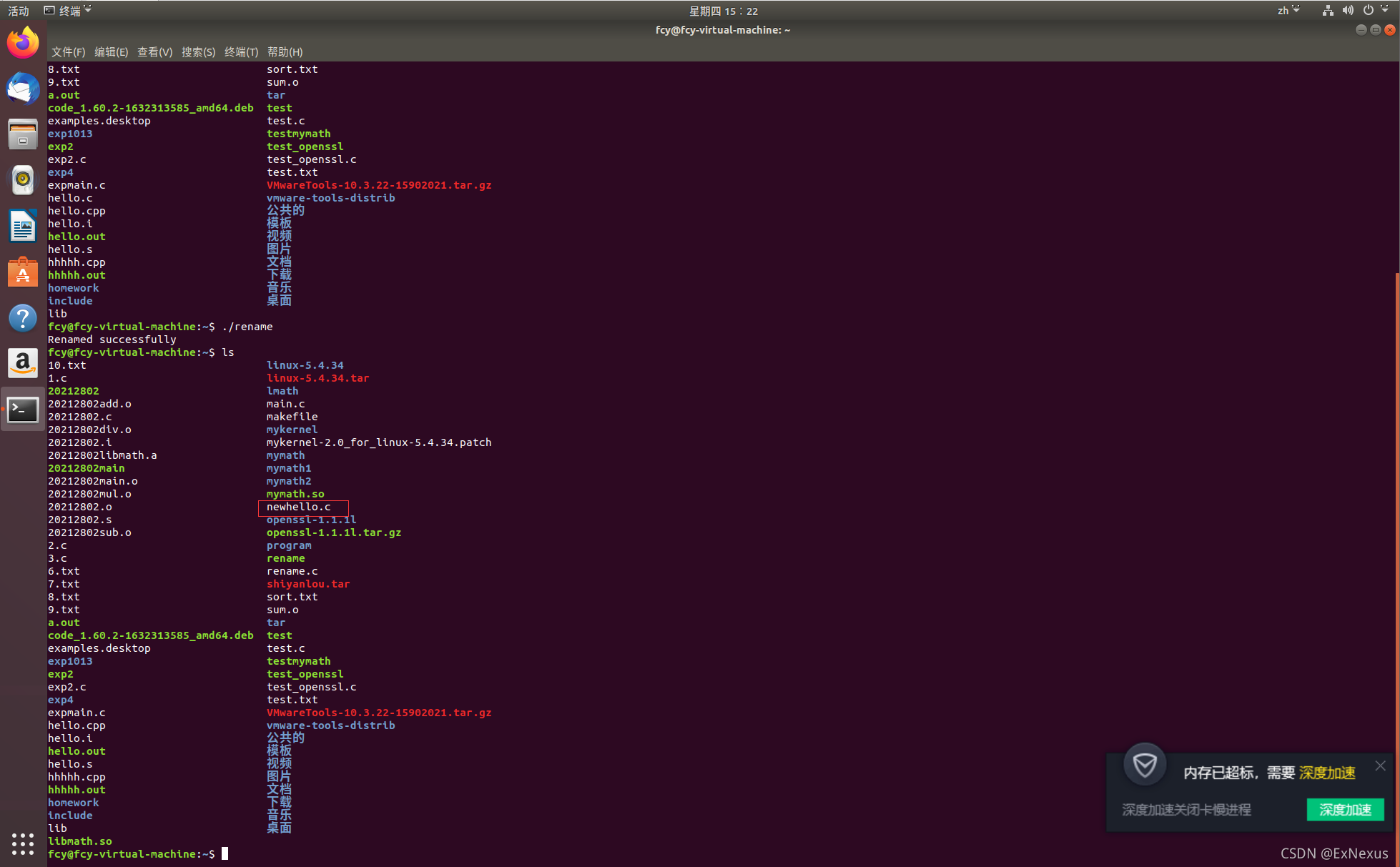 本实验我选择的是系统调用号为 38 的 sys_rename(),功能实现设计为将hello.c 文件重新命名 newhello.c