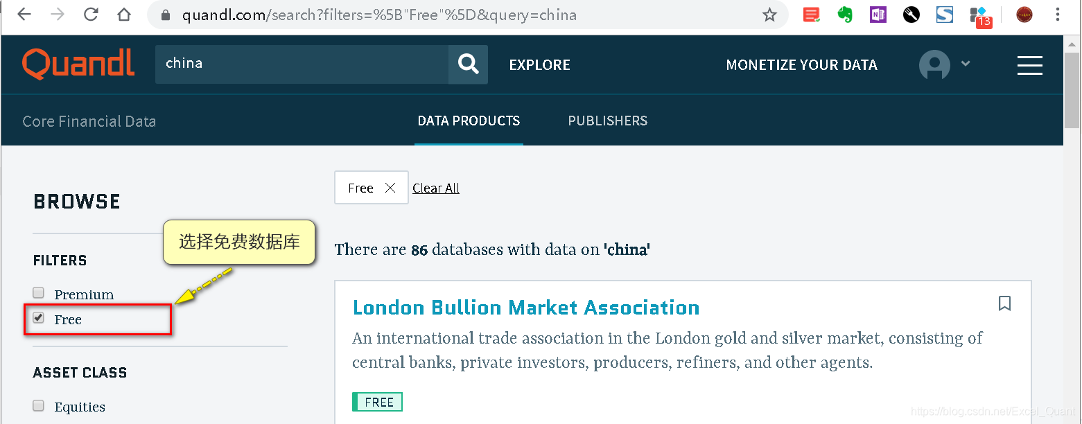 要注意选择免费的数据库。本例我们选择美股名称为“WIKI”的数据库。