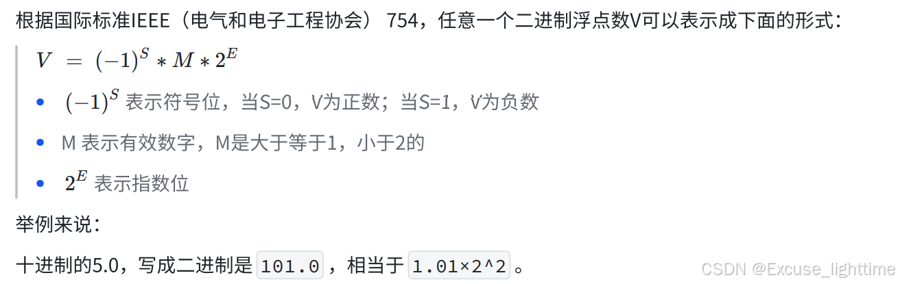 如果是十进制的 -5.0 ,写成⼆进制是 -101.0 ,相当于 -1.01×2^2 。那么,