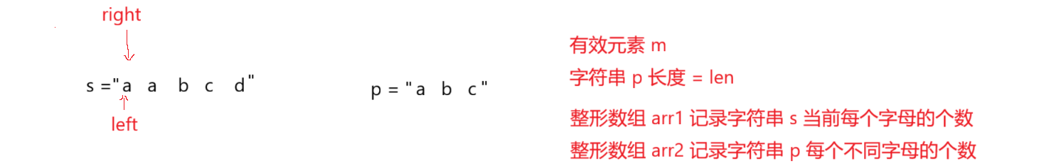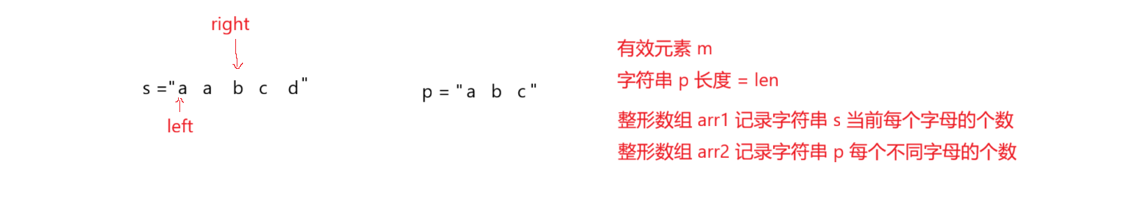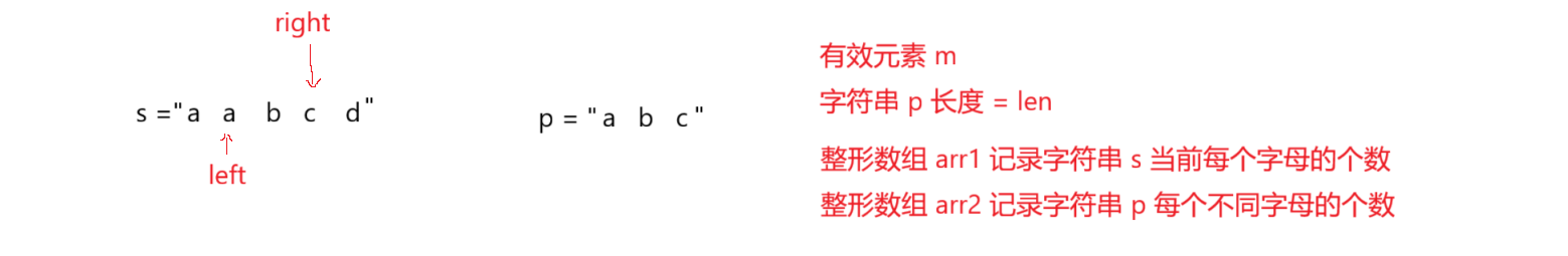 left 操作完后,并且此刻 m 是等于 len 的,说明此刻 left 和 right 区间的字母和字符串 p 符合“字母异位词”的情况。
