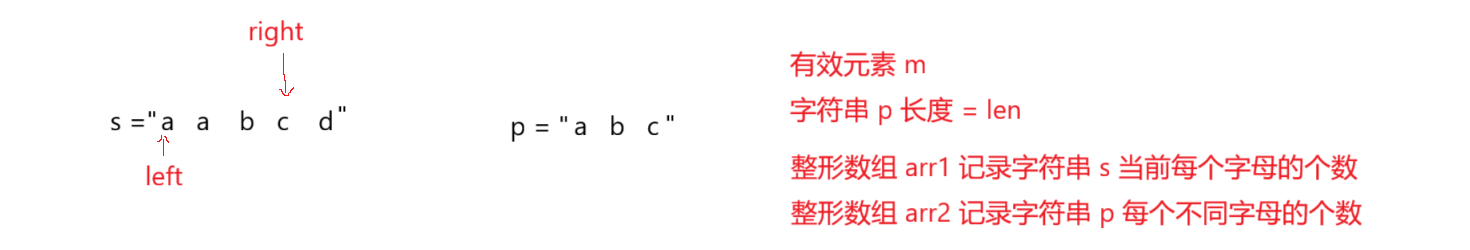 我们注意到,题目给出的提示说字符串 s 和 p 只包含小写字母,那么,我们就可以通过定义整形数组,[ 字符 - 'a' ] 表示对应的字母来当作数组的下标,元素大小表示该字母出现的次数。所以,我们可以通过判断当前有效元素个数是否等于字符串 p 的长度,具体怎么理解,如图: