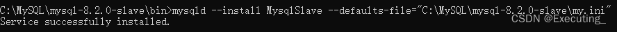 mysqld --install MysqlMaster --defaults-file="C:\MySQL\mysql-8.2.0-slave\my.ini"