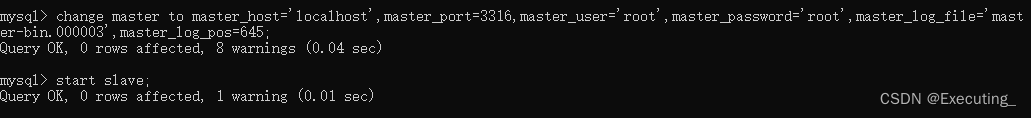 change master to master_host='localhost',master_port=3316,master_user='root',master_password='root',master_log_file='master-bin.000003',master_log_pos=645;