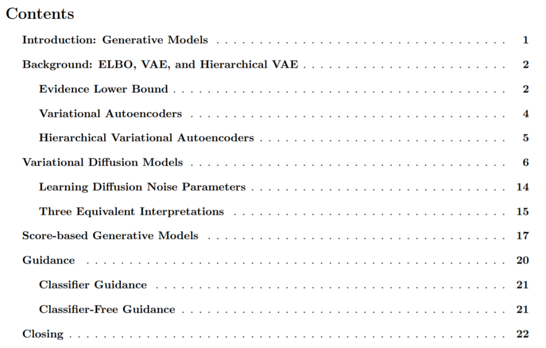 论文共分为 6 部分,主要包括生成模型;ELBO、VAE 和分级 VAE;变分扩散模型;基于分数的生成模型等。