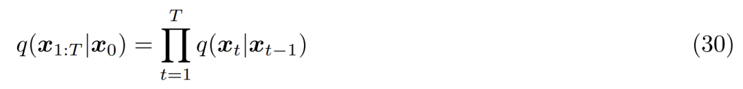 从第一个假设开始,由于符号的滥用,现在可以将真实数据样本和潜在变量表示为 x_t,其中 t=0 表示真实样本数据,t ∈ [1, T] 表示相应的潜在变量,它的层级结构由 t 进行索引。VDM 后验与 MHVAE 后验相同,但现在可以重写为如下: