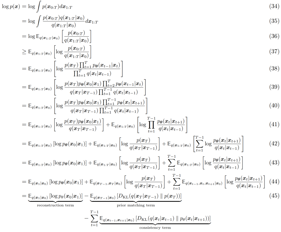 与任何 HVAE 相似的是,VDM 可以通过最大化证据下界(Evidence Lower Bound, ELBO)来优化,可以推导如下:
