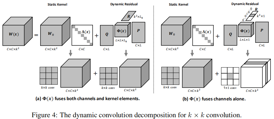 我们发现:Φ(x)×1Q\Phi(x)\times_1 QΦ(x)×1Q要比Φ(x)×3R\Phi(x)\times_3 RΦ(x)×3R更重要。因此,我们将LkL_kLk降低到1,并将L对应提升。此时,R简化为one-hot向量。上图给出了该形式下的动态卷积示意图。从上图b可以看到:动态残差仅仅具有一个非零切片,这等价于1×11\times 11×1卷积。因此**k×kk\times kk×k卷积的DCD等价于在静态核上添加了1×11\times 11×1动态残差**。