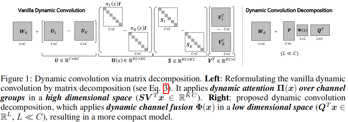 下图给出了上述矩阵分解的示意图,也就是说:通过分解,W(x)W(x)W(x)的动态特性可以通过动态残差UΠ(x)SVTU\Pi(x)SV^TUΠ(x)SVT实现,而动态残差则是将输入x投影到了更高维空间SVTxSV^TxSVTx,然后再实施动态注意力Π(x)\Pi(x)Π(x)。这也就意味着:常规动态卷积的局限性源于通道组上的注意力,它引入了一个高维隐空间,导致较小的注意力值可能会抑制相应核的学习。