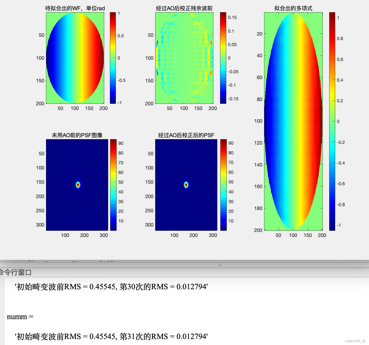 DMvot_total = []; % 拟合多项式需要的电压 modes = 35; for j = 1:35 zernn = zernike(2:modes+1,'resolution',nPx); C = zeros(modes,1); C(j) = 0.1 * 1e-6; % 拟合第i个Zenrike zernn.c = C; ngs = ngs.* zernn*wfs*cam ; WF_ini = ngs.meanRmPhase; loopGain = 0.030; row = 2; column = 3; figure(3) subplot(row,column,1);imagesc(WF_ini);colorbar;colormap(jet);title('待拟合出的WF,单位rad') subplot(row,column,4);imagesc(cam.frame);colormap(jet);colorbar;title('未用AO前的PSF图像') RMS_ini = std(WF_ini); i = 1; RMS = []; DM_vot = []; flag = 1; while (flag == 1) ngs = ngs * dm * wfs * cam; dm.coefs = 0.4*dm.coefs - loopGain* pinv(Slope) * wfs.slopes *1e-6; % 单位 要到um级别 DM_vot(:,i) = dm.coefs; subplot(row,column,5);imagesc(cam.frame);colormap(jet);colorbar;title('经过AO后校正后的PSF') subplot(row,column,2);imagesc(ngs.meanRmPhase);colorbar;colormap(jet);title('经过AO后校正残余波前') subplot(row,column,[3,6]);imagesc(WF_ini - ngs.meanRmPhase);colorbar;colormap(jet);title('拟合出的多项式') numm = ['第',num2str(i),'次的RMS = ',num2str( std(ngs.meanRmPhase(:)) )] RMS(:,i) = std(ngs.meanRmPhase(:)); if ( i > 30 && (RMS(:,i-1) - RMS(:,i) < 1e-3) ) flag = 0; end drawnow; pause(0.1) i = i+1; end DMvot_total(:,j) = sum(DM_vot,2) * 1e6 ; end