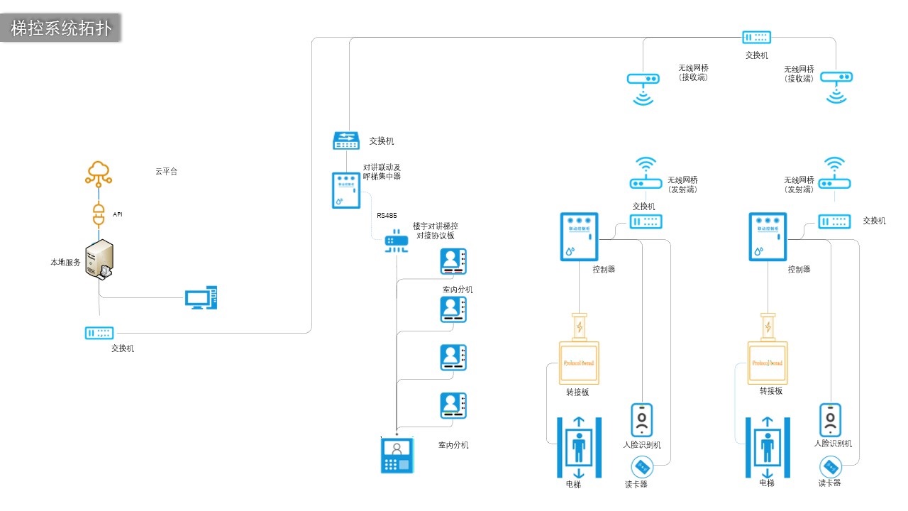 - 访客联动:访客扫码开门 → 系统自动分配电梯并点亮指定楼层 → 实现定向通行;