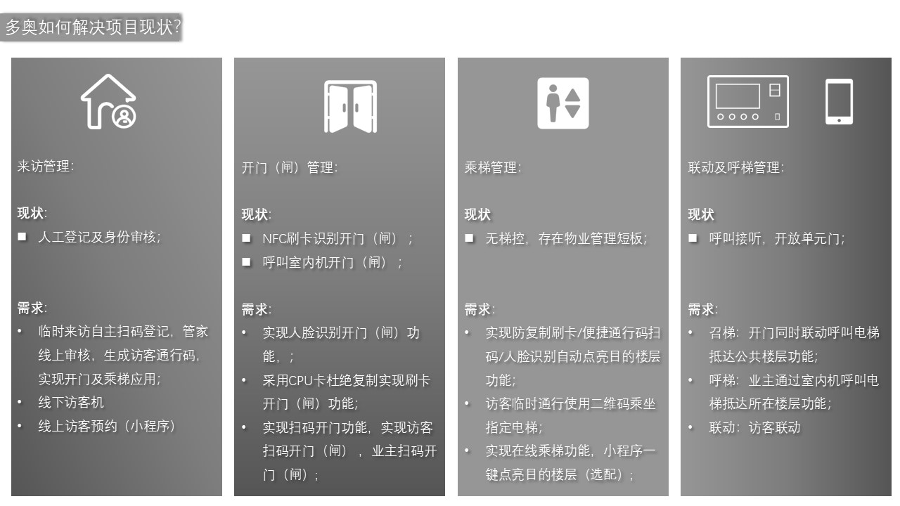 我们将从当前电梯管理的痛点出发,结合用户提供的具体需求,系统性地分析多奥在电梯智能化升级中的解决方案。该方案不仅聚焦于访客管理、开门管理、乘梯控制等核心场景,还通过技术手段实现了系统联动、数据闭环和安全管理。以下是结构化、专业化的深度解析: