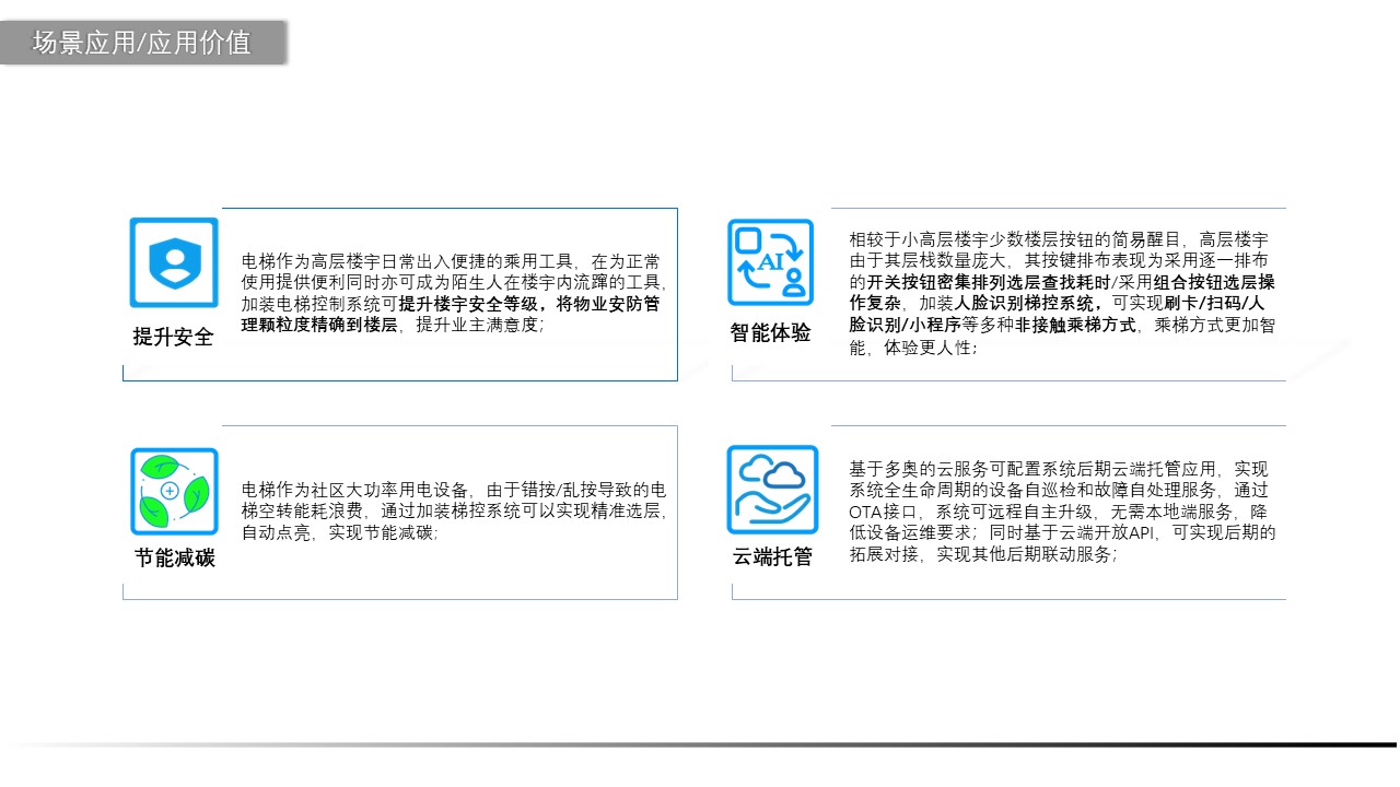 - 系统与电梯完全隔离,确保电梯安全运行(故障时自动脱离梯控恢复原始状态)。