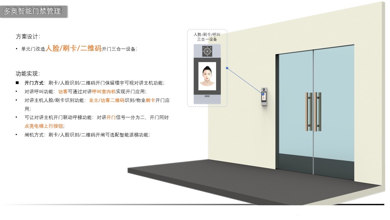 多奥梯控系统整合人脸识别、刷卡和二维码扫描三种开门方式,并实现与对讲、闸机、门禁、访客联动的方案设计详细说明: