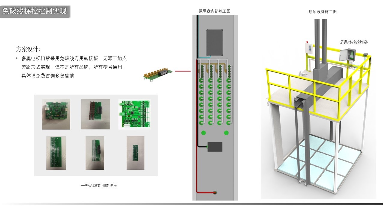 - 采用多奥专用转接板(需根据电梯品牌型号确认兼容性),通过无源干接点旁路形式控制电梯按键,无需破坏电梯原有线路。
