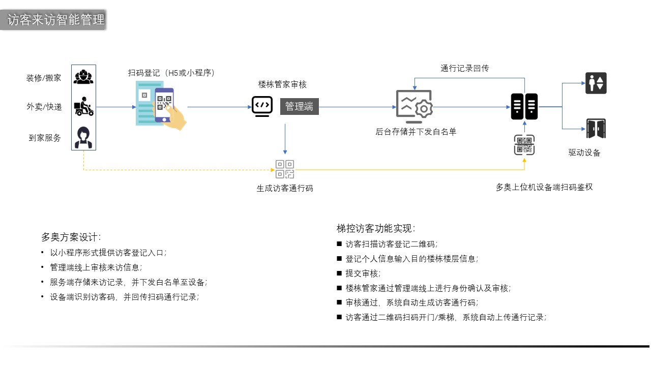 - 访客乘梯:通过业主分享的动态二维码扫码登记楼层。
