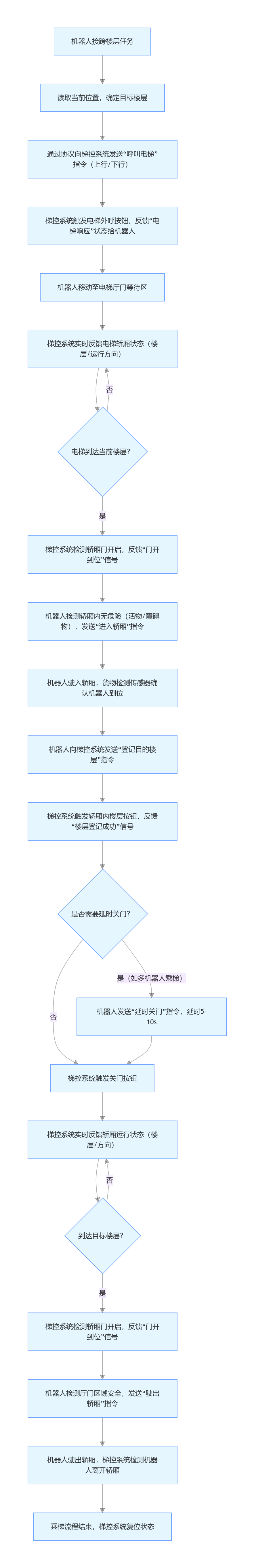 - 梯控系统确认机器人离开:部分系统可能通过货物检测传感器或机器人自身反馈确认机器人已完全离开轿厢。