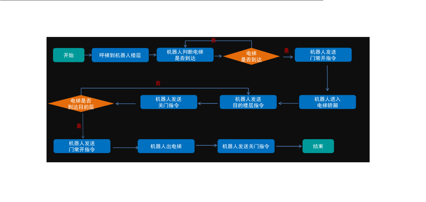- 电梯关门,乘梯流程结束:电梯门延时关闭,梯控系统本次服务结束,等待下一次乘梯请求。机器人则开始执行到达目的楼层后的任务。