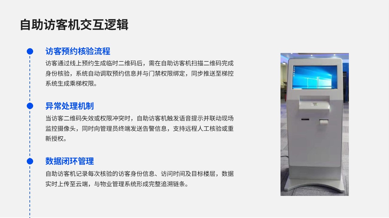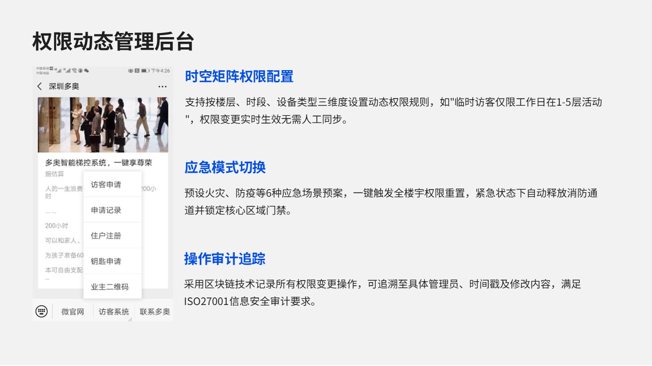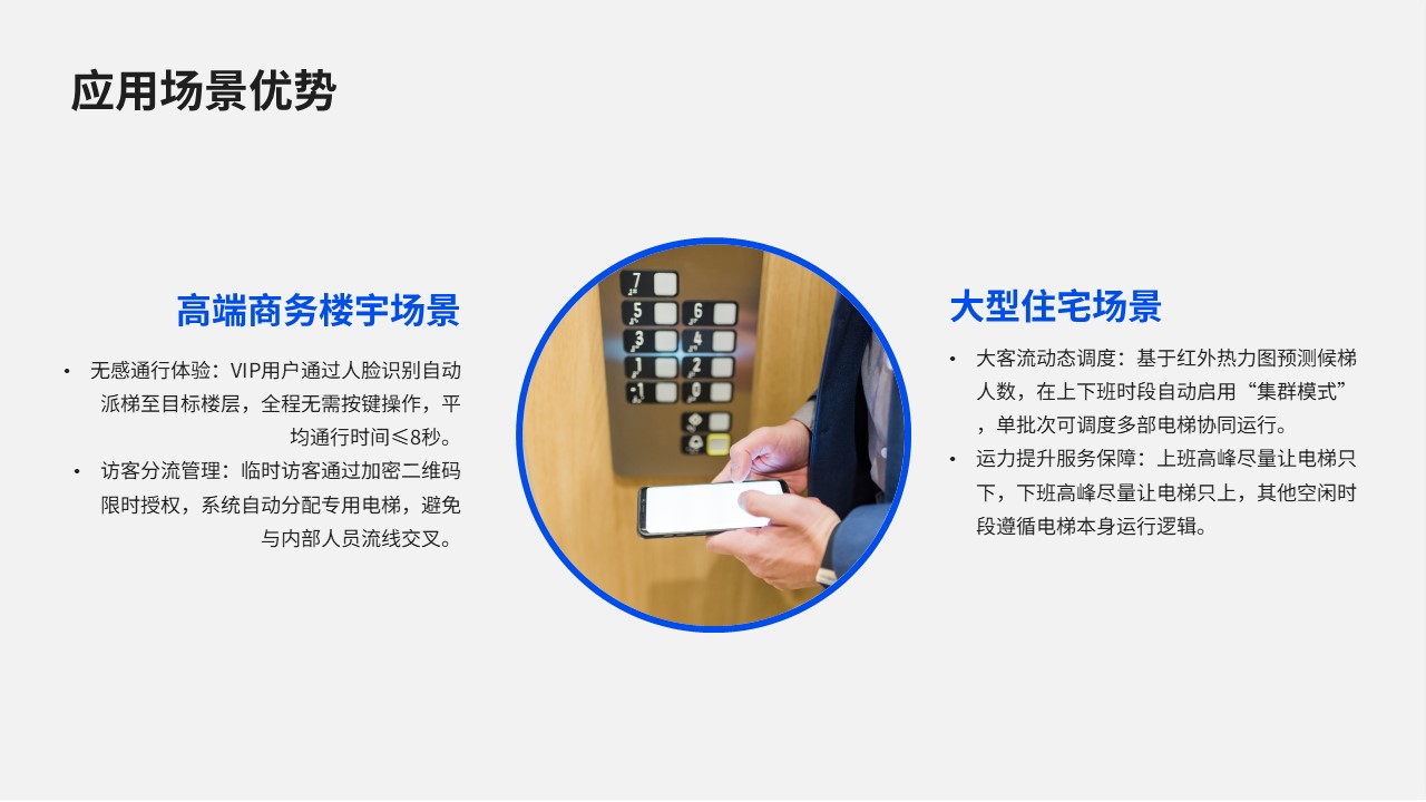 | 管理后台 | 梯控管理软件+云服务平台 | 权限分层管理(VIP/员工/访客),实时监控2000+终端,OTA远程升级,能耗分析报表。 |