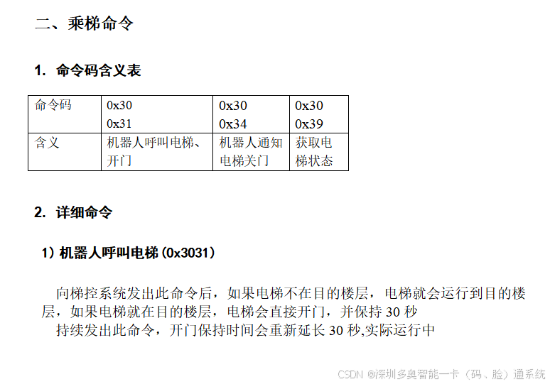 呼叫电梯命令:机器人发起呼叫,指定当前楼层。命令示例:call_elevator(current_floor)call_elevator(current_floor),电梯响应是否成功。