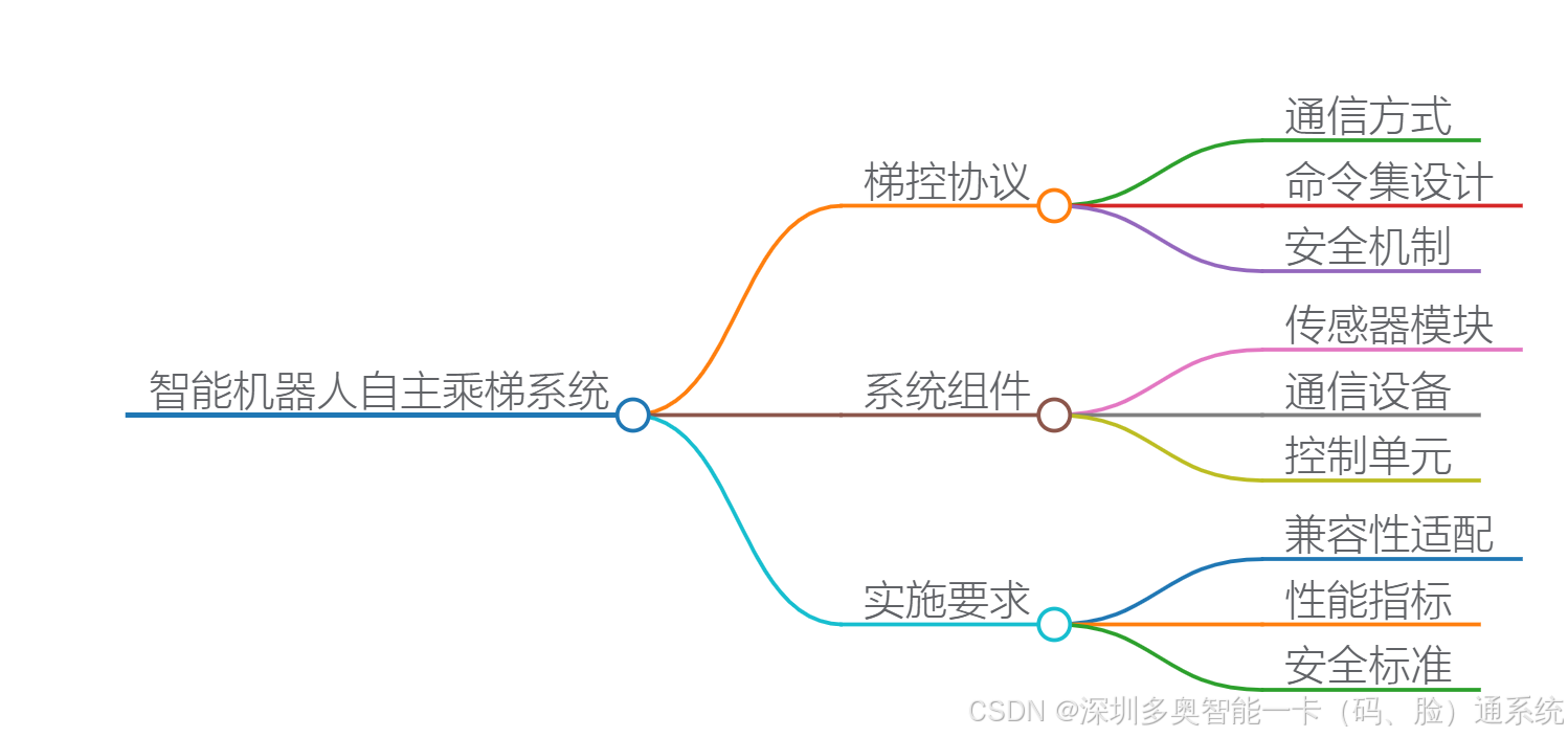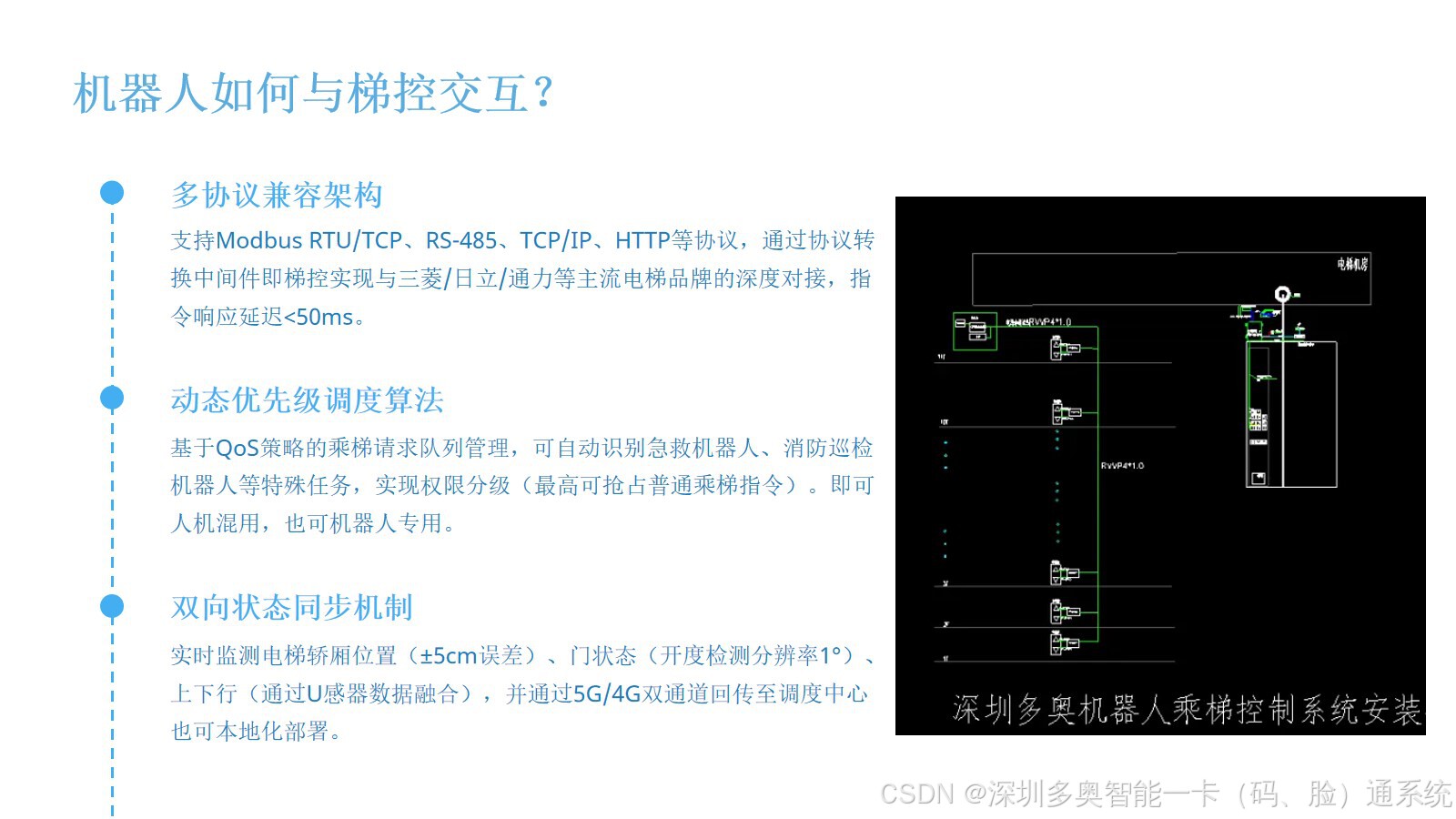 智能机器人(AGV/AMR/机器狗)自主乘梯系统通过梯控协议实现机器人与电梯的无缝对接,确保安全高效的跨楼层运输。多奥梯控系统作为行业领先方案,提供了完整的协议支持与硬件配置,以下是详细说明: