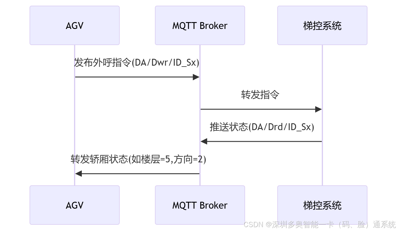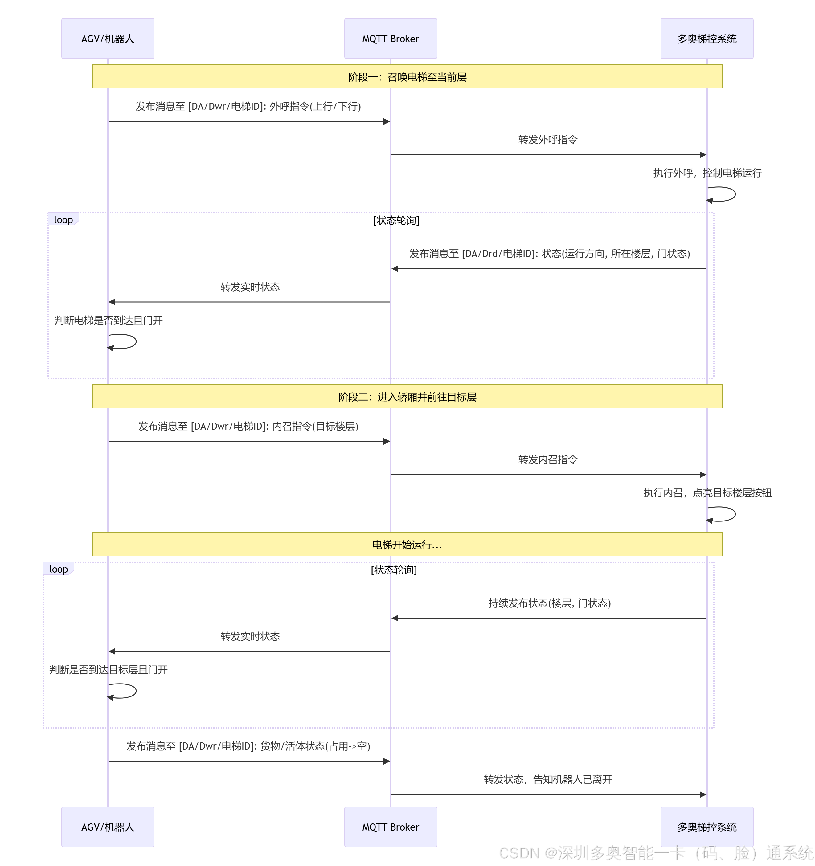AGV/机器人对接多奥梯控门禁系统的核心思路是:机器人作为MQTT客户端,通过订阅和发布特定主题的消息,与梯控系统实现“状态感知”与“指令控制”的闭环。下面为你梳理了完整的对接流程与关键指令。