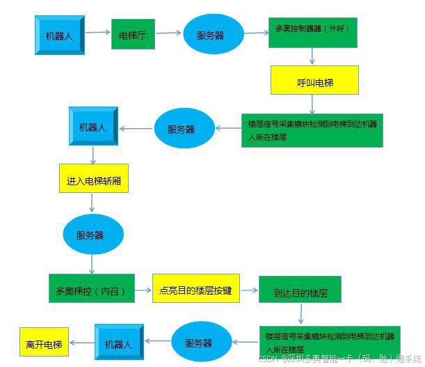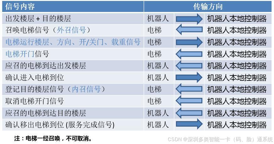 | 机器人跨楼层配送 | 外呼电梯 → 开启门禁 → 进入轿厢 → 内召目标层 → 出梯关闭门禁 |