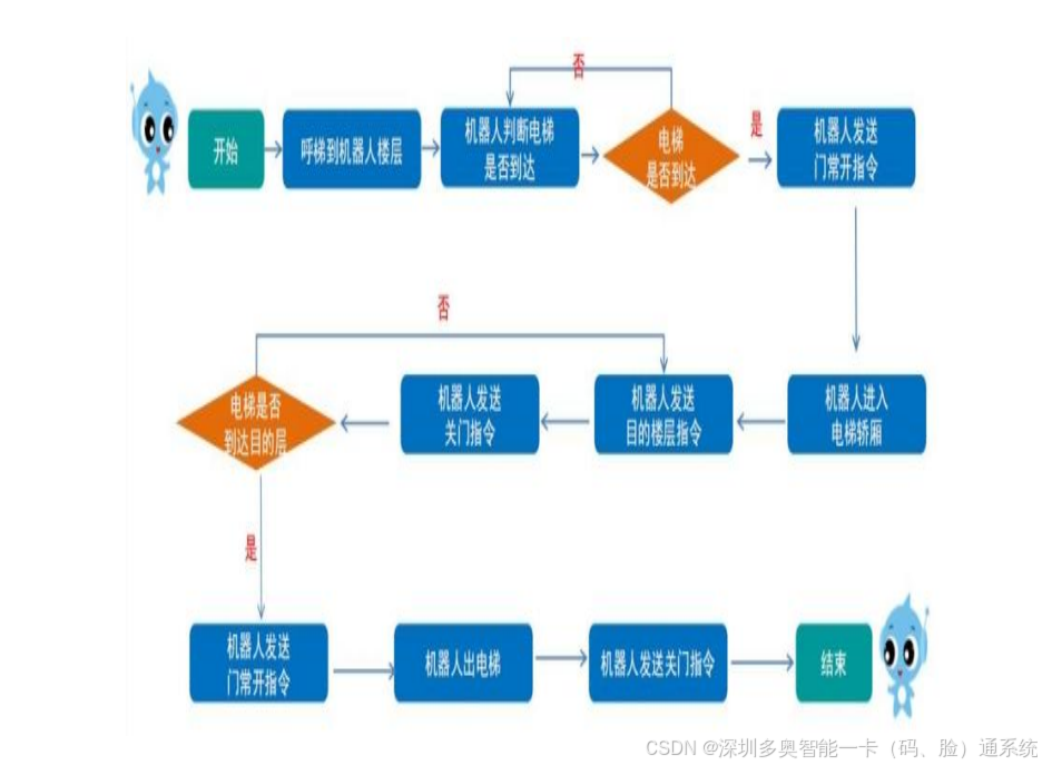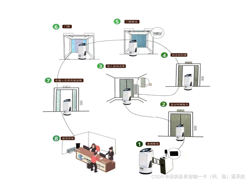 尽管多奥系统支持丰富的控制接口,但针对 AGV、机器人、AMR 类移动载体,仅需关注以下四个核心功能点即可完成全流程乘梯任务: