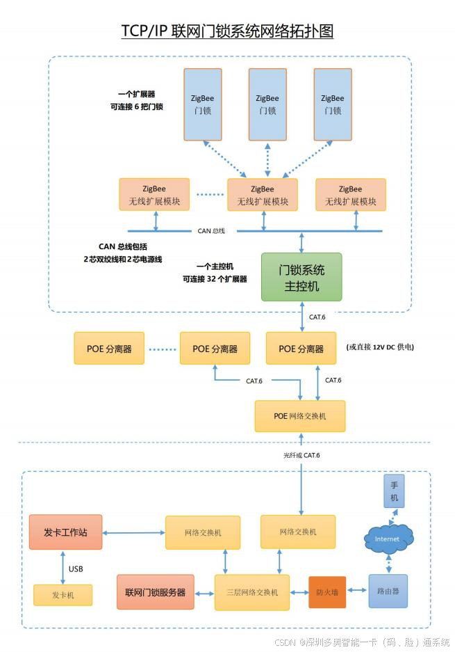低功耗:ZigBee+PoE组合,门锁待机功耗<$0.1$W。