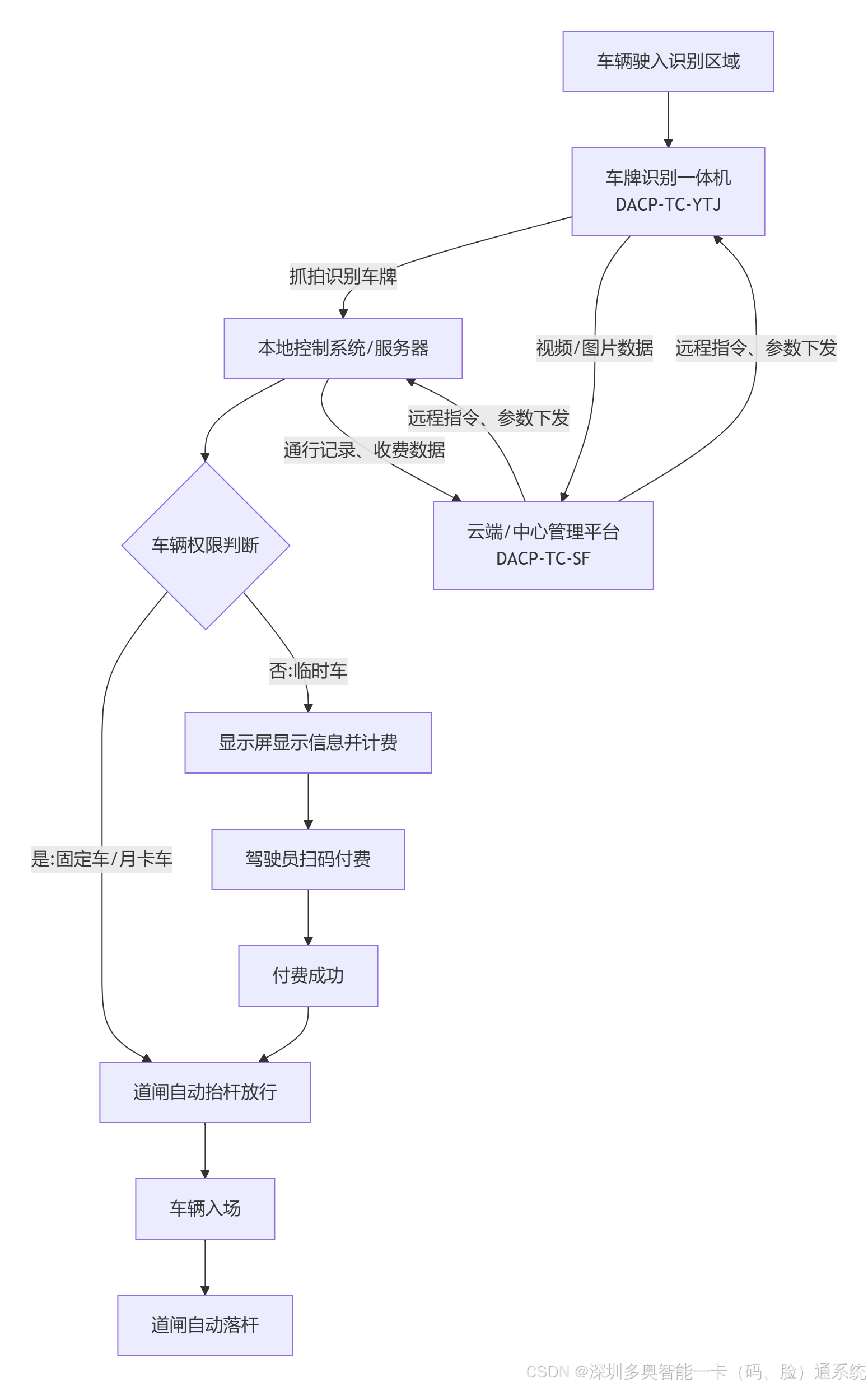 A[车辆驶入识别区域] --> B[车牌识别一体机<br>DACP-TC-YTJ]