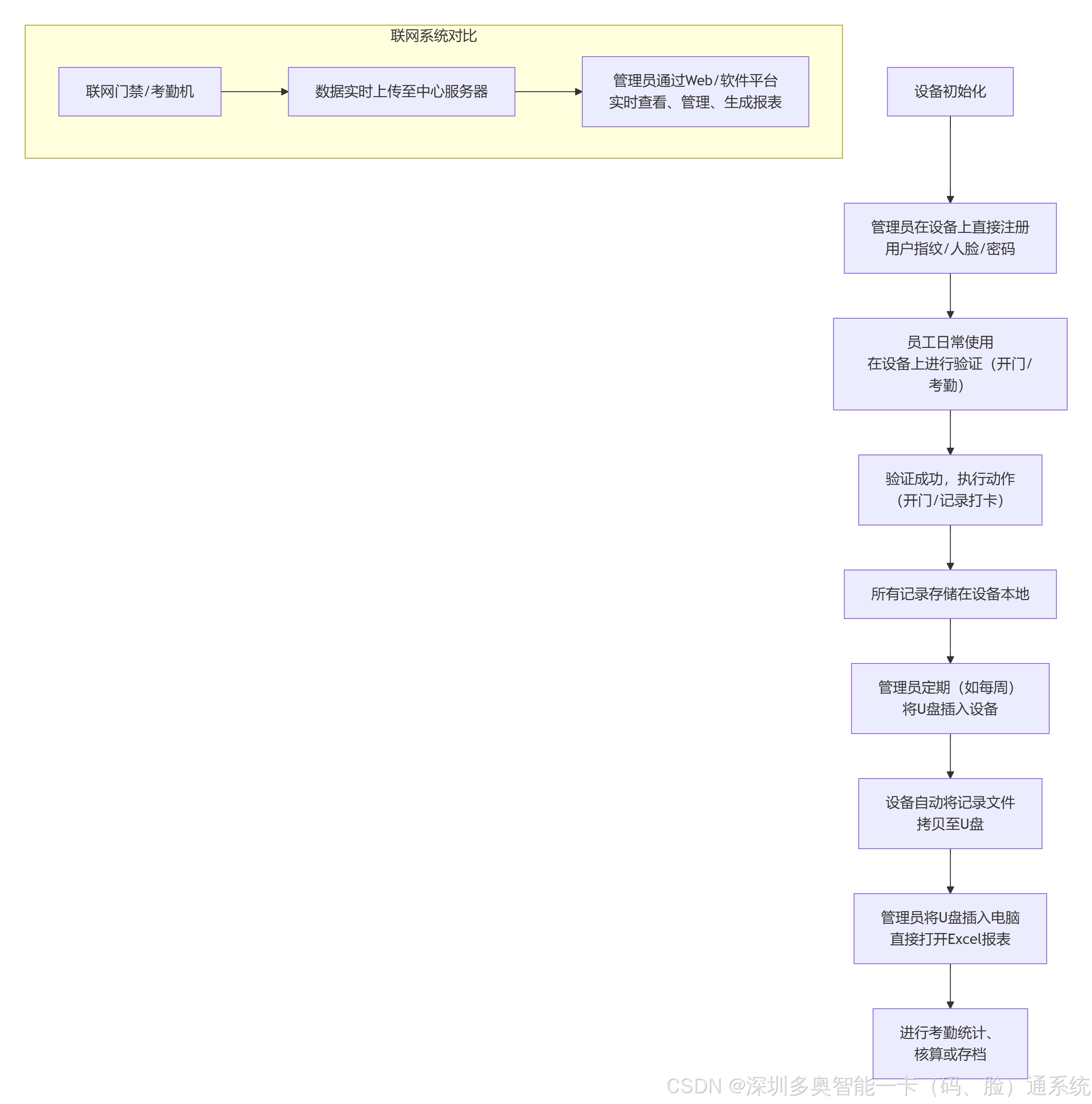 核心优势:极大降低管理复杂度。管理员只需定期插U盘即可获取所有打卡记录的Excel文件,直接用于统计或导入HR系统。 | |