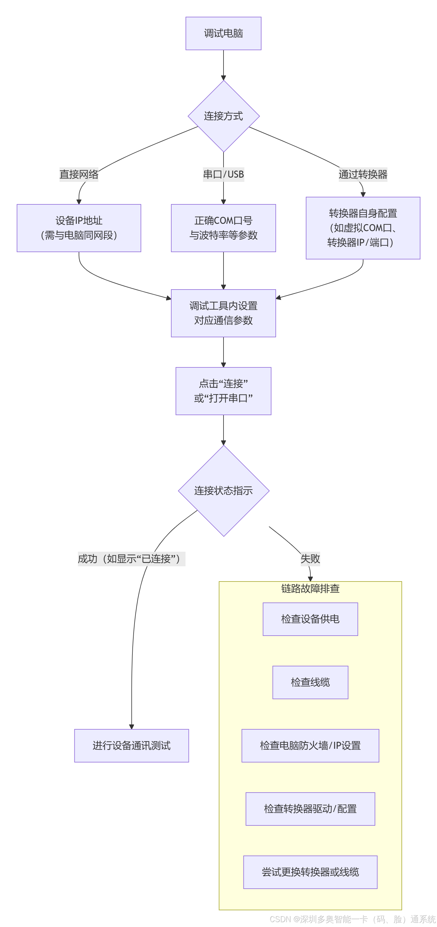 B -- 串口/USB --> D[正确COM口号<br>与波特率等参数]