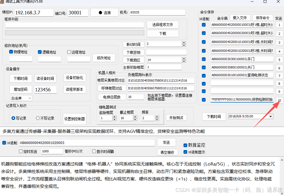 - 机器人乘梯(AGV/AMR): 这属于高阶应用,必须使用专门的梯控调试工具来配置协议对接,普通的消费机调试工具是无法使用的。