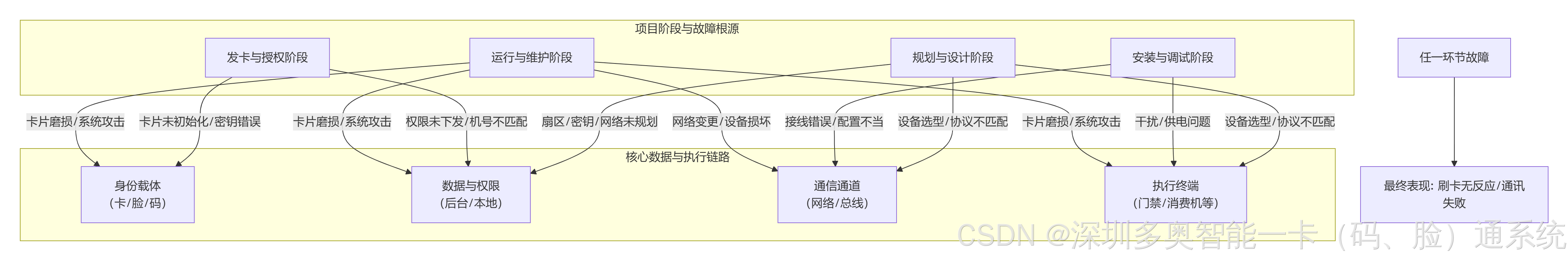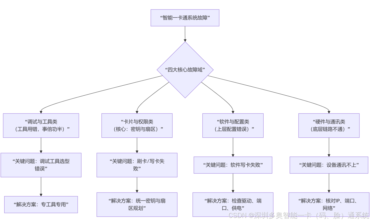 A[“智能一卡通系统故障”] --> B{“四大核心故障域”}