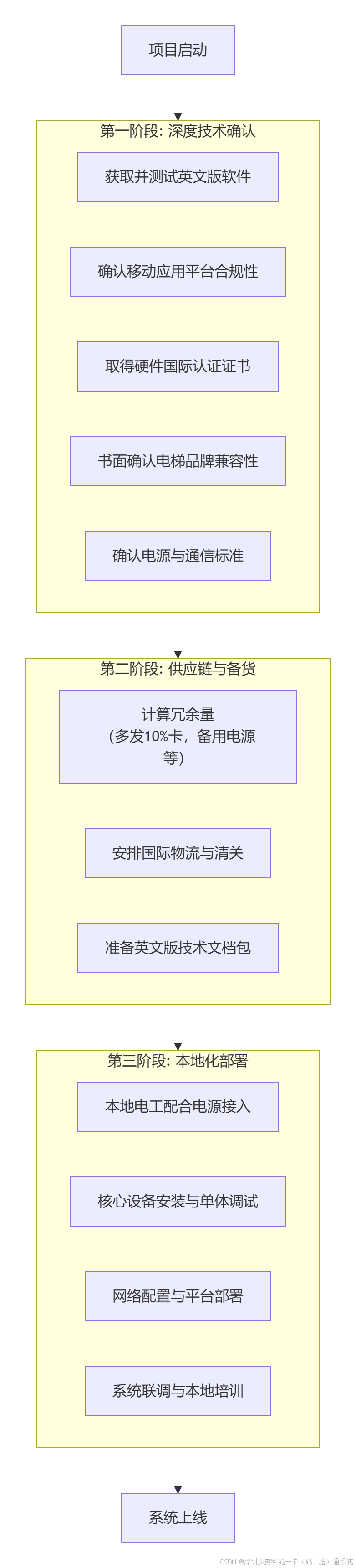 电梯品牌兼容性:这是最大技术风险。必须提供海外电梯的精确品牌、型号、年检文件,向梯控供应商确认兼容性及是否需要特殊转接板。 | |
