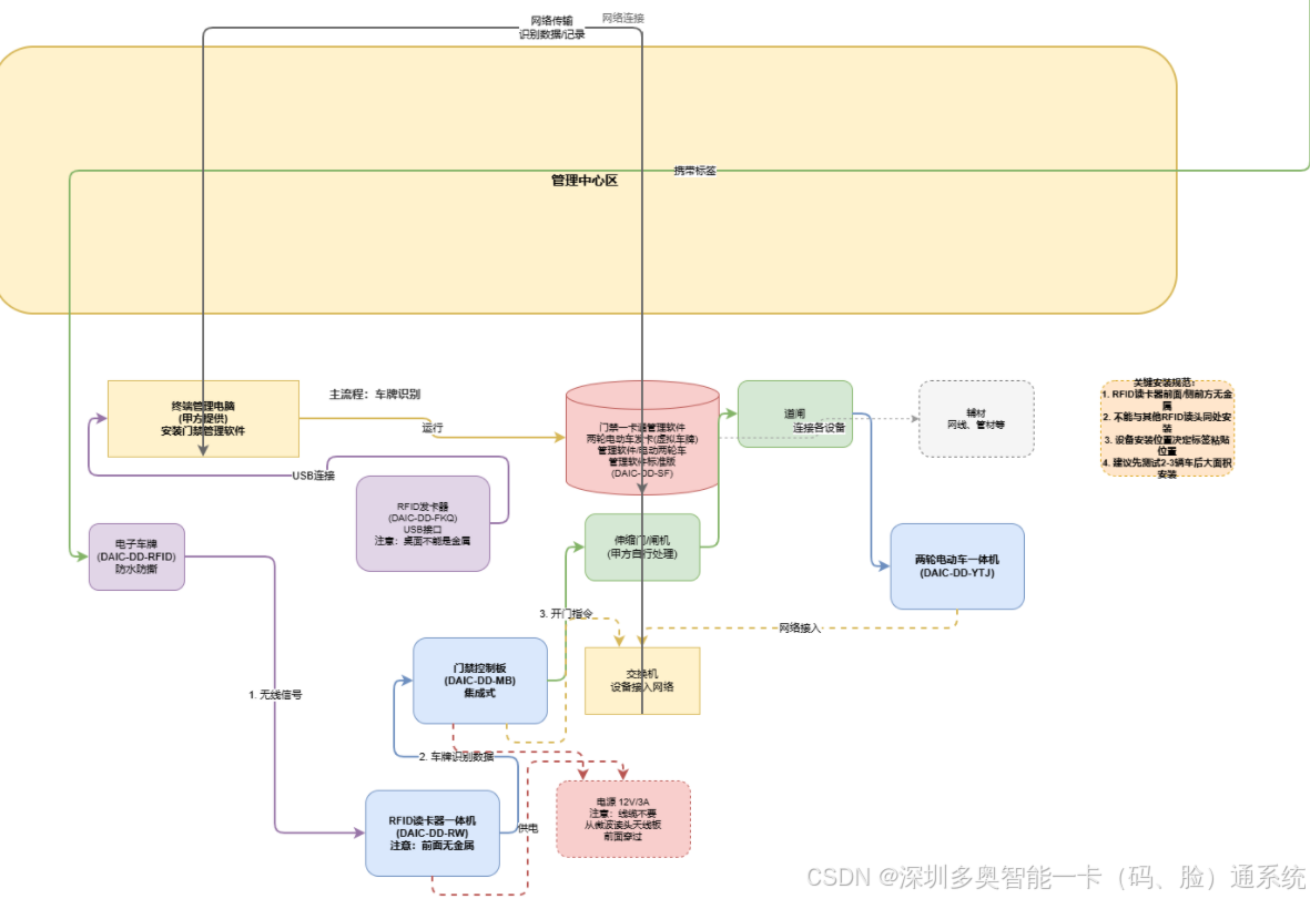 - 系统扩展性:支持与多奥智能一卡通系统无缝对接,实现电动车管理与门禁、梯控、考勤等系统的统一管理;可扩展视频监控联动(识别时抓拍图片,上传至软件存档)。