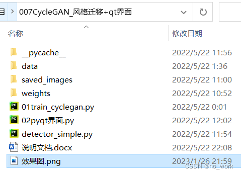 其中data文件夹下是数据集文件,这里是黄马文件夹和斑马文件夹,运行01train_cyclegan.py进行训练,得到的模型存在weights文件夹下。
