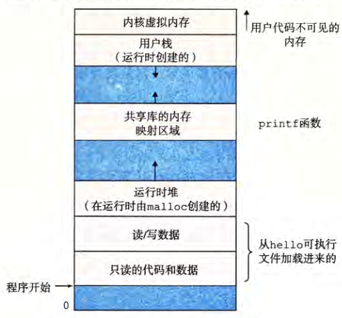 * 堆。代码和数据区后紧随着的是运行时堆。代码和数据区在进程一开始运行时就被指定了大小,与此不同,当调用像 malloc 和 free 这样的 C 标准库函数时,堆可以在运行时动态地扩展和收缩。