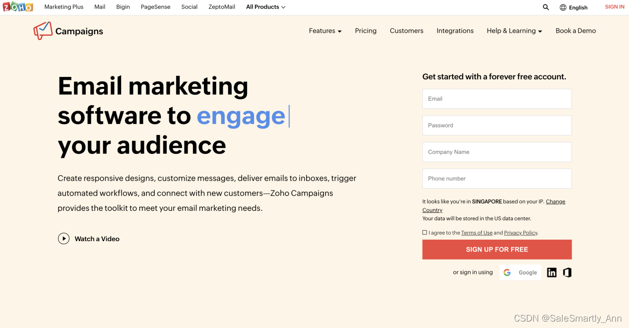 SaaS在线办公套件Zoho有一个名为Zoho Campaigns的电子邮件营销平台。它可以帮助您创建电子邮件营销日历、发送个性化电子邮件并跟踪您的绩效。其永久免费计划包括12,000封电子邮件和2,000名订阅者。