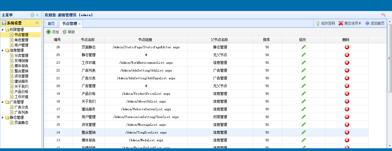 第一张表节点表,也就是你所建立的aspx文件的路径。这张表以父Id的形式递归展示。由于我的针对一个实体的CURD操作是通过如下形式进行的(显示和删除对应的文件格式是:../**List.aspx。增加和修改对应的文件格式是:../**Editor.aspx。),所以权限只能控制到实体而不能控制到CURD。