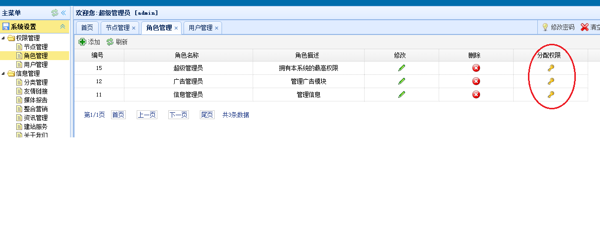 第五步:在角色列表中,给角色分配权限。实际上就是选择上图中的节点。如下图: