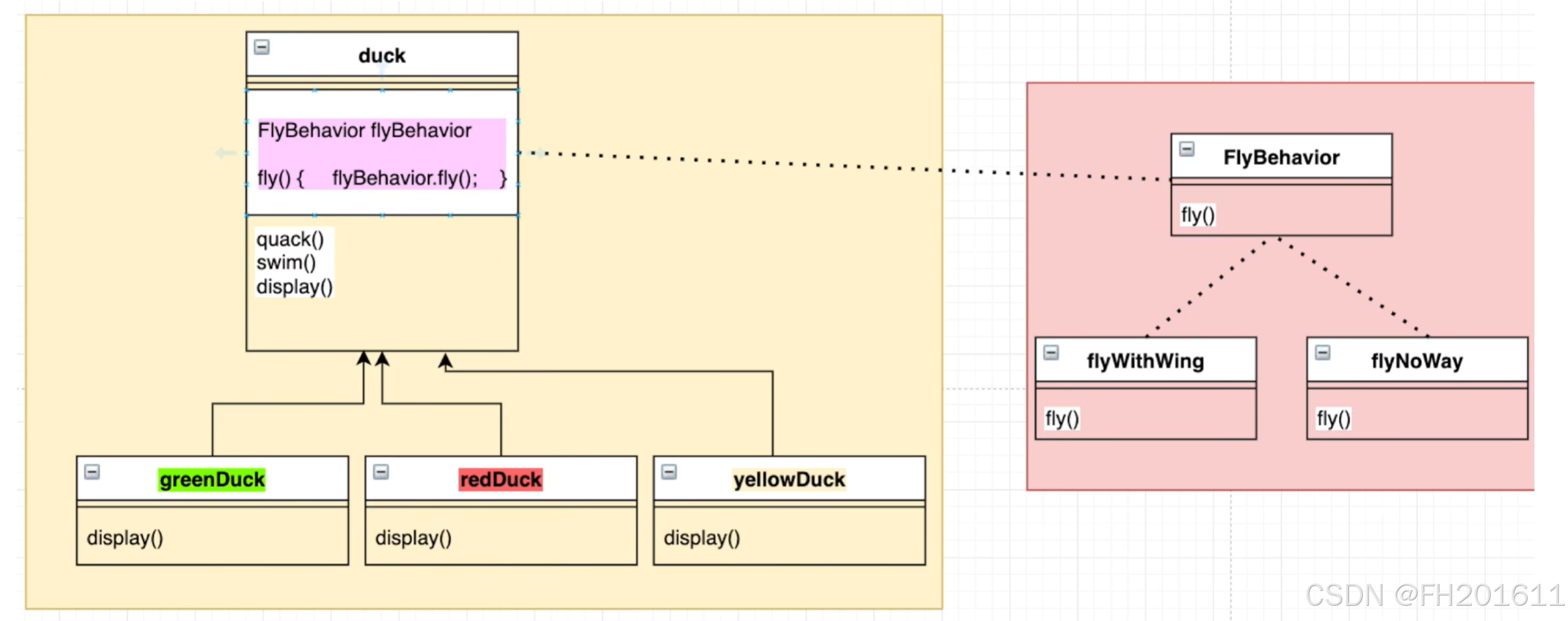 如上图所示,将可能需要变动或具有多种实现方法的代码FlyBehavior定义为一个接口,然后就可以创建多个实现。通过在另一个接口实现类定义成员变量的方法将两种行为桥接在一起,这样在创建一个类对象时,通过传入指定的另一个类的实现类型来实现其行为类型。