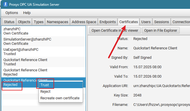 产生证书后,在连接完成一次服务端(这里用模拟服务器Prosys做示例), 服务端会把证书放到不信任列表,并返回错误:Error establishing a connection: Error received from remote host: BadSecurityChecksFailed。因此需要在证书列表上,把Rejecte改为Trust。