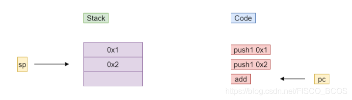 这里用半动画的方式解释其执行过程。下图中,sp表示栈顶指针,pc表示程序计数器。当执行完push1 0x1后,pc和sp均往下移: