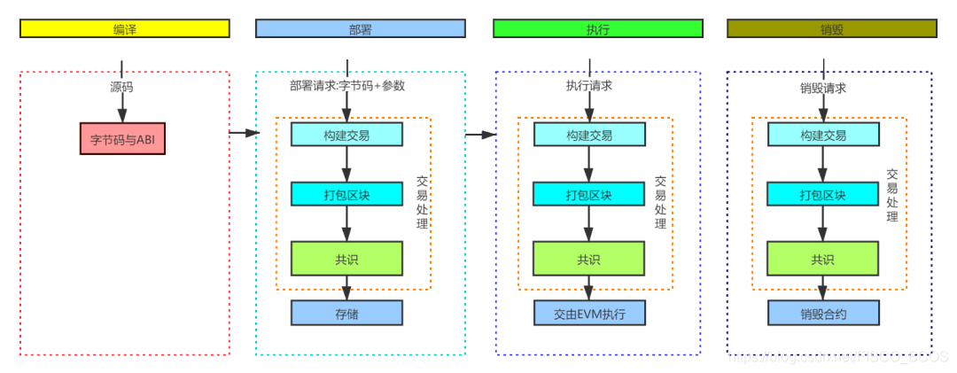 当用户准备调用该合约上的函数时,调用请求同样也会经历交易、区块、共识的过程,最终在各节点上由EVM虚拟机来执行。