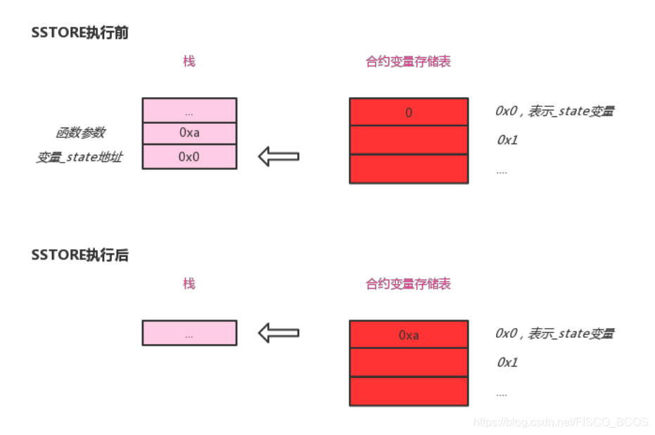 在EVM中,由SSTORE字节码将参数0xa存储到合约字段_state中。该字节码先从栈上拿到状态字段_state的地址与新值0xa,随后完成实际存储。
