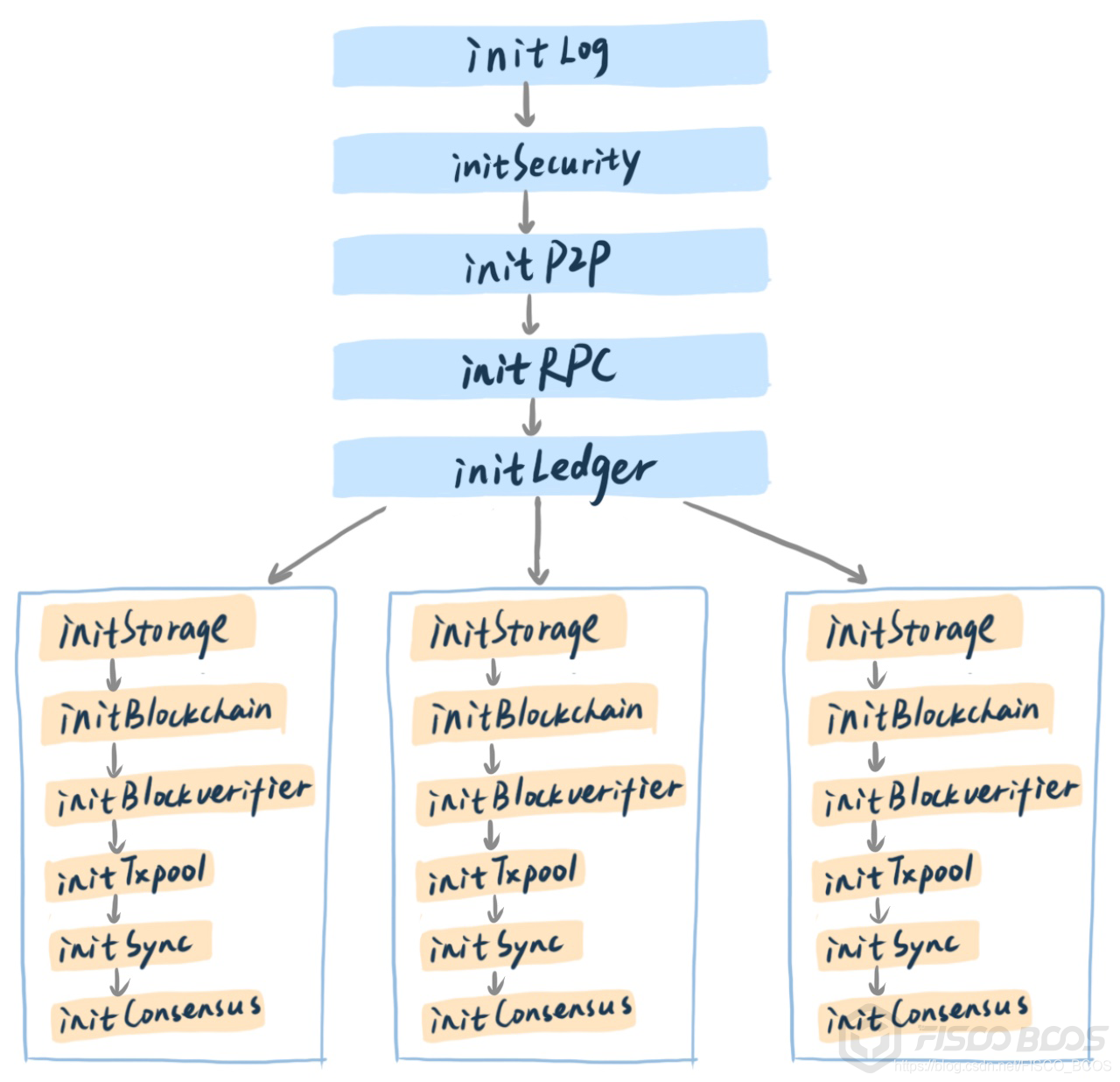 通过启动顺序可以知道FISCO BCOS的一个重要特性——支持多群组账本,每个群组是一个独立的Ledger模块,每个Ledger具有独立的存储、同步、共识处理功能。
