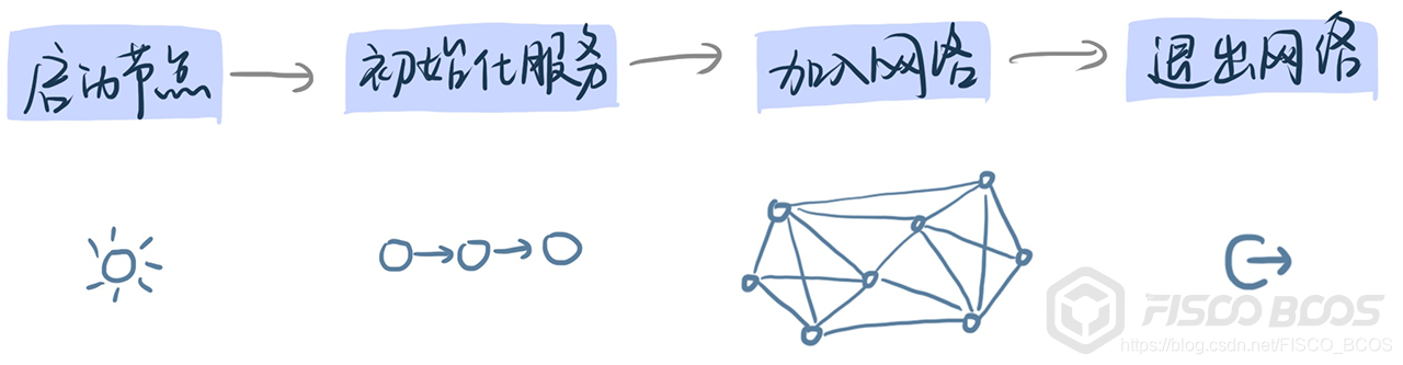 由于不同区块链在部署架构上略有差异,系统运行方式也有所不同,但万变不离其宗,系统视角来看,每个区块链系统都要经历节点初始化、建立点对点网络、完成分布式交互的过程。