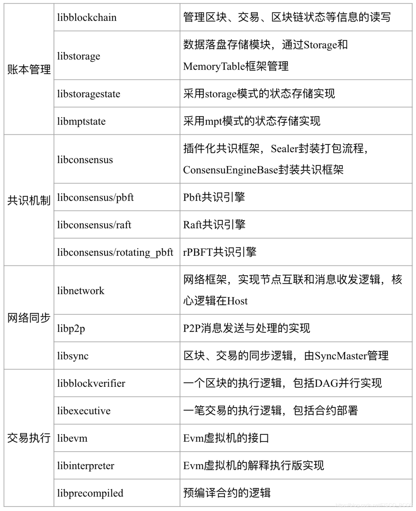项目核心源码包括fisco-bcos程序入口代码,以及libxxx的各模块代码,根据模块的名字可以快速识别其对应功能,这里也体现了一个项目源码质量的高低,高质量的代码应该是“代码即注释”。